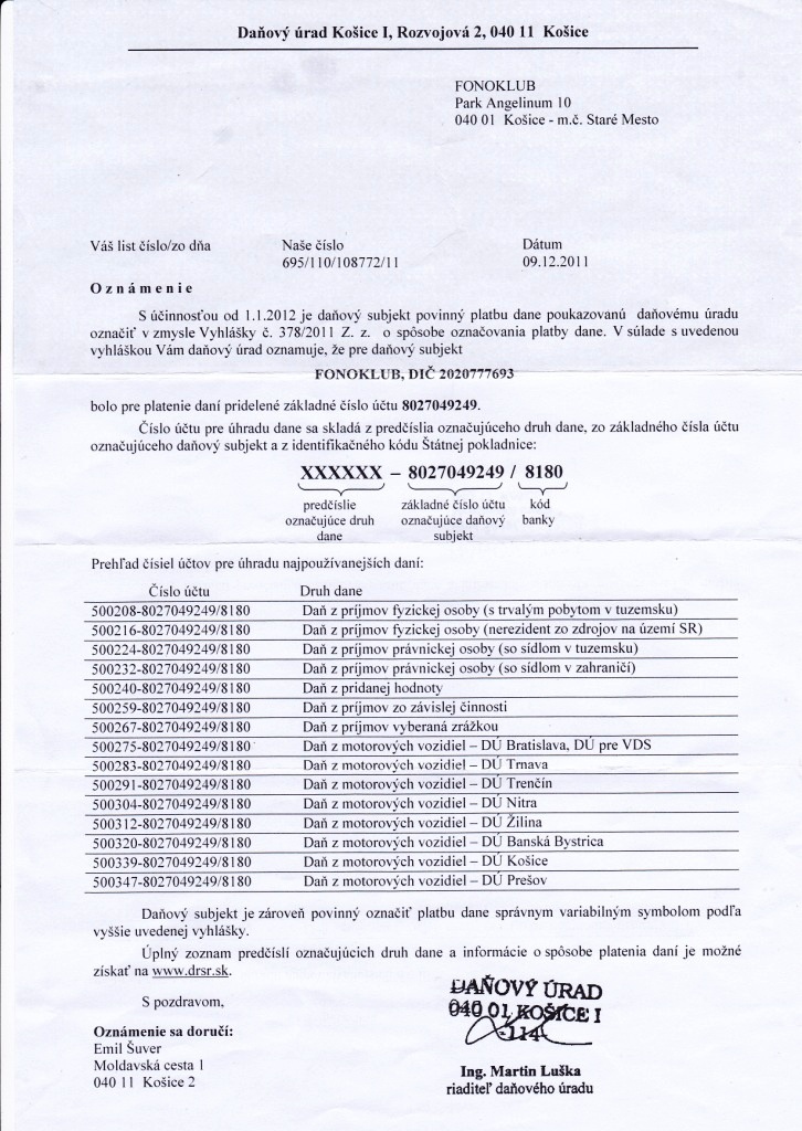 Od 1.1.2012 je zmena, pridelením čísiel účtov k jednotlivým druhom daní. DIČ: 2020777693