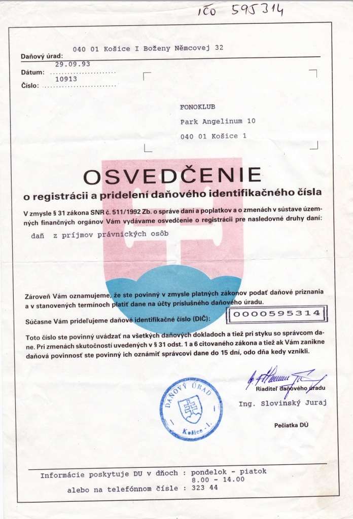 Daňové identifikačné číslo vydané Daňovým úradom Košice I