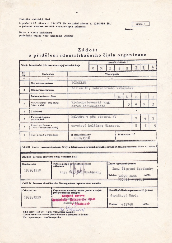 Pôvodné tlačivo pridelenia identifikačného čísla organizácie z roku 1990 vydané Federálním statistickým úřadem.